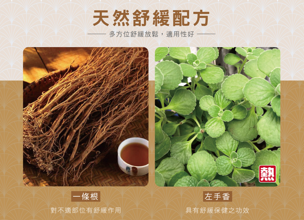(熱感)全 成 份:一條根萃取(闊葉大豆)、艾草葉萃取、左手香葉萃取、山鹽青葉萃取、薰衣草精油、薄荷葉萃取、辣椒萃取物、樹脂。